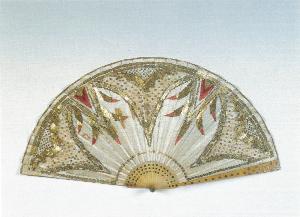 Ventaglio pieghevole. Diciassette stecche in corno biondo decorate con dischetti metallici in tre ordini; motivo più fitto sulle stecche di guardia che terminano a spatola; estremità delle stecche dipinte in celeste. Rivetto con strass in alveolo di metallo.\nPagina in taffetas di seta azzurrina ricamata con paillettes dorate di diversa misura; filo di seta rosso e filo metallico dorato. Sul campo della pagina si affacciano due grandi petali che continuano in due metà laterali, profilati da nastri di paillettes. Sui petali scendono dei motivi fiammati da cui si dipartono cinque code, sempre ricamate in paillettes, terminanti a punta rossa ricamata, mentre nelle parti interne le paillettes sono disposte a squame. Bordino di finizione in carta dorata.