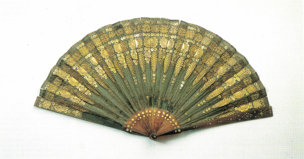 Ventaglio pieghevole. Diciotto stecche in tartaruga con applicazione di dischetti metallici dorati in due ordini; guardie a spatola decorte da dischetti metallici dorati disposti a formare semplici piccoli motivi geometrici. Rivetto e occhiello in metallo.\nPagina in taffetas di seta verde ricamata; la parte superiore è decorata da una triplice fila di placchette in lamina dorata, di varia forma, intervallate da paillettes da cui discendono, in corrispondenza delle stecche, lunghe foglie bipartite su cui si innestano tre paillettes in verticale. Bordino di finizione in carta dorata.