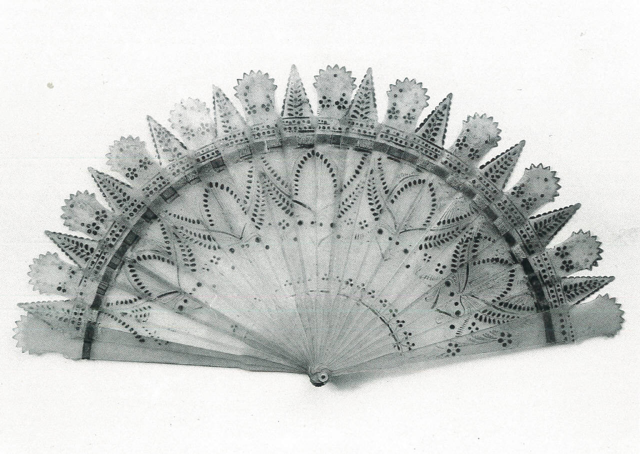 Ventaglio brisé. Ventitre stecche di corno biondo intagliate e lumeggiate. Le estremità delle stecche terminano alternatamente a cuspide con un profilo minutamente centinato e a semicerchio dentato. All'interno sono dipinti in oro e bruno fregi floreali e spighe dipinte in oro. Gli stessi motivi si ripetono anche sull'altro lato del ventaglio. Rivetto in ottone e occhiello in madreperla; nastro in taffetas di seta verde.\nVentaglio del tipo detto "a cattedrale" per via delle punte cuspidate. Da notare l'estremità inferiore della stecca di guardia attorno al rivetto, in quanto la forma non è tonda come solitamente si trova nei ventagli di questo periodo, ma è a foglia trilobata.