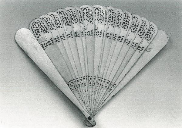 Ventaglio brisé. Sedici stecche ampie a spatola stondata in legno tinto bianco, traforate nella parte inferiore a motivi cruciformi tra due ordini di forellini. Nell'estremità superiore arabeschi ed ovali interrotti da una fascia liscia con asola al centro per il passaggio del nastrino in tela di cotone bianco. Le guardie sono invece lisce e prive di decori. Rivetto in metallo, occhiello in ottone.