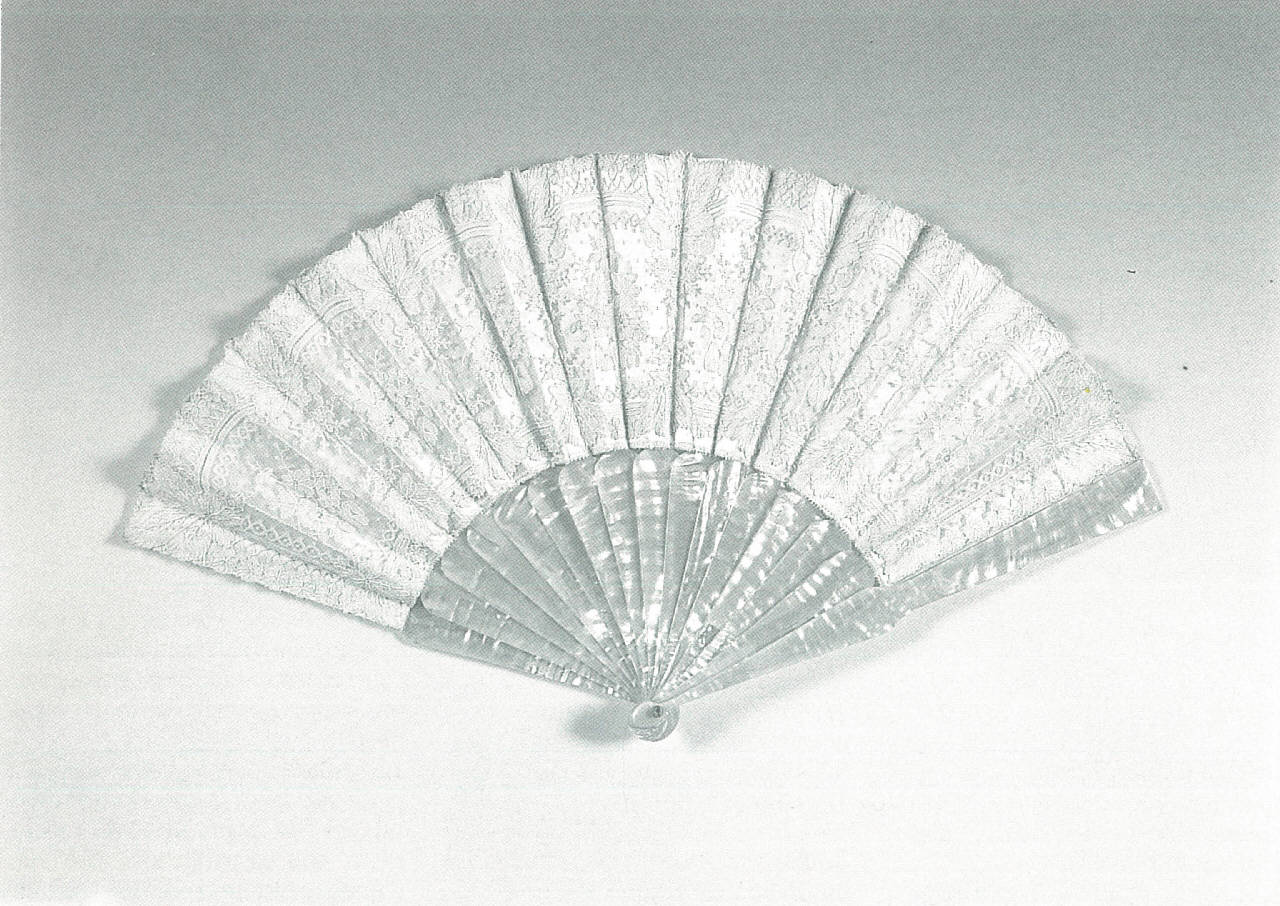 Ventaglio pieghevole da nozze. Sedici stecche lisce stondate in madreperla "gold fish" rosa, guardie a spatola tronca; perno in cristallo di rocca incastonato in argentone.\nPagina in pizzo Bruxelles color avorio lavorato ad ago "point de gazze", eseguito in filato di lino e applicato su fondo in raso di seta color avorio. Il disegno del pizzo è a motivi floreali legati da un fondo di tulle: si distinguono sette mazzetti di fiori divisi da foglie e da tre fiori, disposti a grappolo, compresi tra due nastri cuspidati, interrotti da foglie di vite e sormontati da fiorellini a cinque petali. Il pizzo, eseguito appositamente per la pagina del ventaglio, è di notevole livello tecnico anche se il disegno non presenta particolari raffinatezze compositive se non nei motivi angolari di raccordo. Bordino di finizione al verso in taffetas di seta avorio.