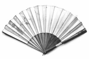 Ventaglio pieghevole. Quindici stecche in legno dipinto e lucidato. Sulle guardie è stata incollata una stecca di bambou naturale con applicate rispettivamente le lettere "L" e "D" in metallo argentato sormontate da corona comitale. Rivetto e anello reggiventaglio in ottone, occhiello in osso bianco.\nPagina doppia in raso di seta verde-acqua ricamata. Sulla pagina a sinistra è ricamato, in tre tonalità di giallo a punto pieno, il monogramma intrecciato "M D L", sormontato da una corona comitale; le lettere sono attraversate da un rametto di nontiscordardime, ricamato in azzurro e grigio. Le iniziali sono quelle della contessa Mina (Guglielmina) Durini Litta, ripetute sulle stecche di guardia. Bordino di finizione in seta blu in basso e taffetas di seta crema in alto.