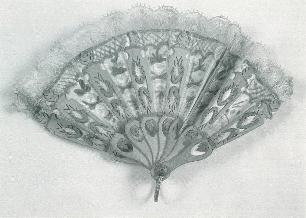 Ventaglio pieghevole. Otto stecche di legno naturale, intagliate e traforate. Rivetto in metallo, occhiello martellato e anello reggiventaglio inciso in ottone.\nPagina in raso di seta giallina dipinta a tempera. La morfologia delle stecche e il decoro della pagina creano un effetto giardino: roselline e foglioline verdi appaiono dipinte negli interstizi tra le stecche, a forma di colonne da giardino reggivaso, e il bordo superiore a piccole maglie romboidali simula una rete metallica di protezione. Applicazione di merletto meccanico "Valencienne" sul bordo della pagina.\nSi tratta di un modello giocattolo per una bambola.