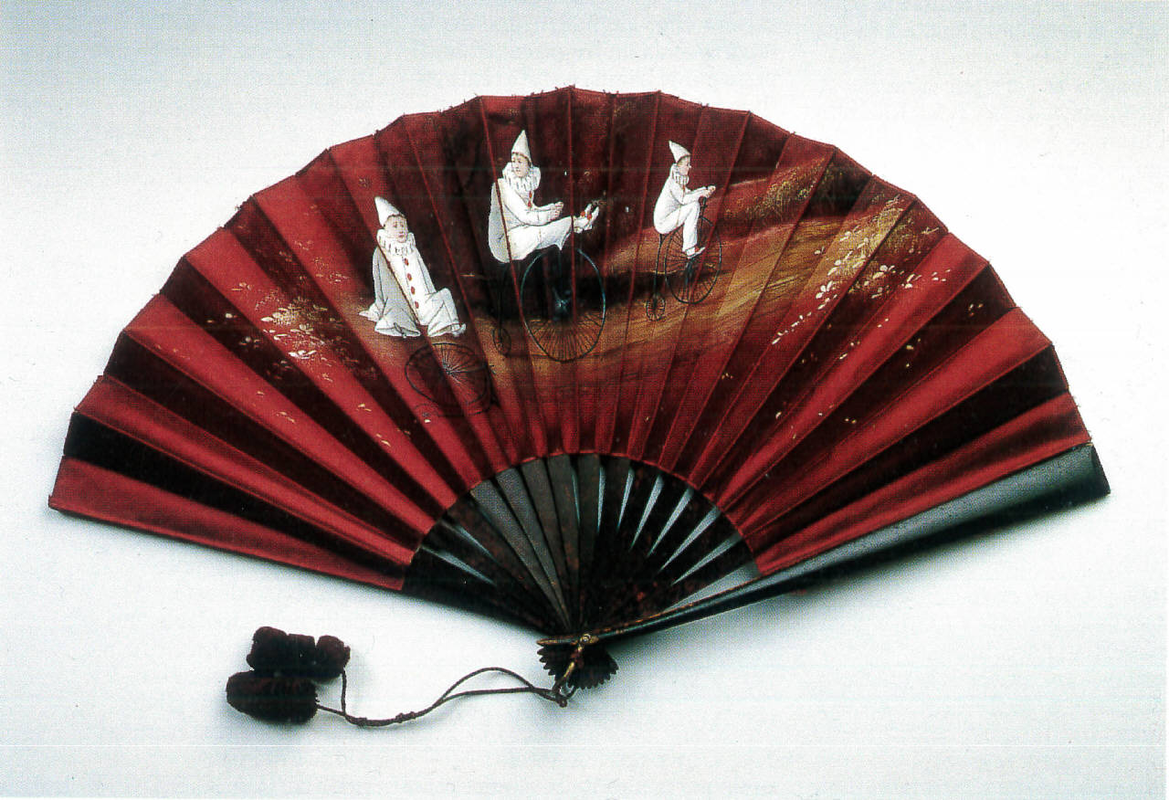 Ventaglio pieghevole. Sedici stecche di legno dipinto ad imitazione del legnno di radica. Guardie a spatola smussata, leggermente bombate e lisce come le stecche minori. Rivetto in metallo, occhiello e anello reggiventaglio in ottone.\nCordoncino in seta bordeau con due pompon. Pagina doppia in raso di seta rosso dipinto anteriormente. Bordino di finizione in raso di seta rosso.