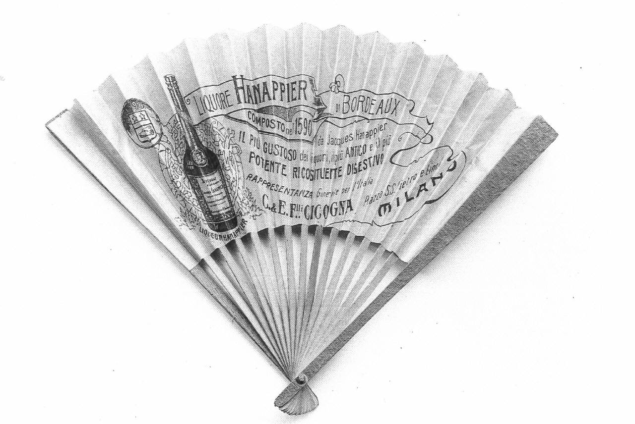 Ventaglio pieghevole pubblicitario. Quindici stecche in legno. Rivetto e occhiello in metallo.\nPagina doppia in carta beige litografata in nero e a colori.