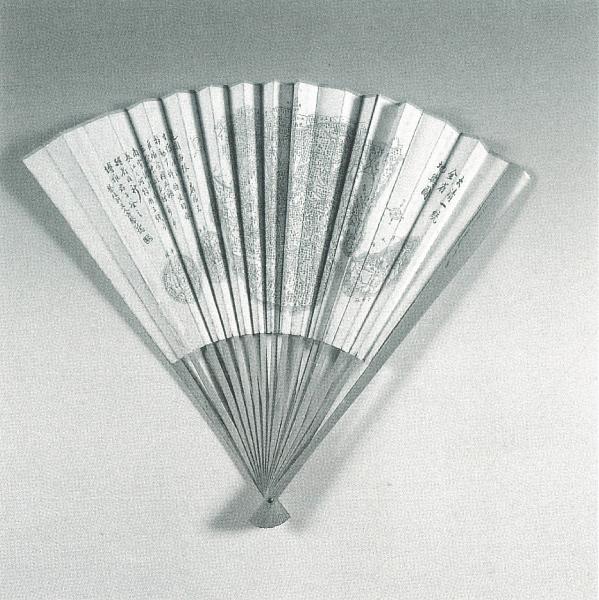 Ventaglio pieghevole. Sedici stecche lisce sottili in bambou; guardie a spatola tronca. Rivetto in metallo laccato nero.\nPagina doppia in carta bianca litografata. Al recto è riportata una mappa della Cina, tenuamente acquarellata per aree in rosa e verde; in alto è raffigurato il percorso della Grande Muraglia distinguibile per le merlature. Ai lati due bussole; in basso a sinistra due emisferi e brevi scritte lungo i fianchi. Al verso la pagina è interamente riempita da colonnine di scritte intervallate da lettere rosse. Bordino di finizione in tela verde mela.\nVentaglio-mappa molto popolare tra i visitatori occidentali.