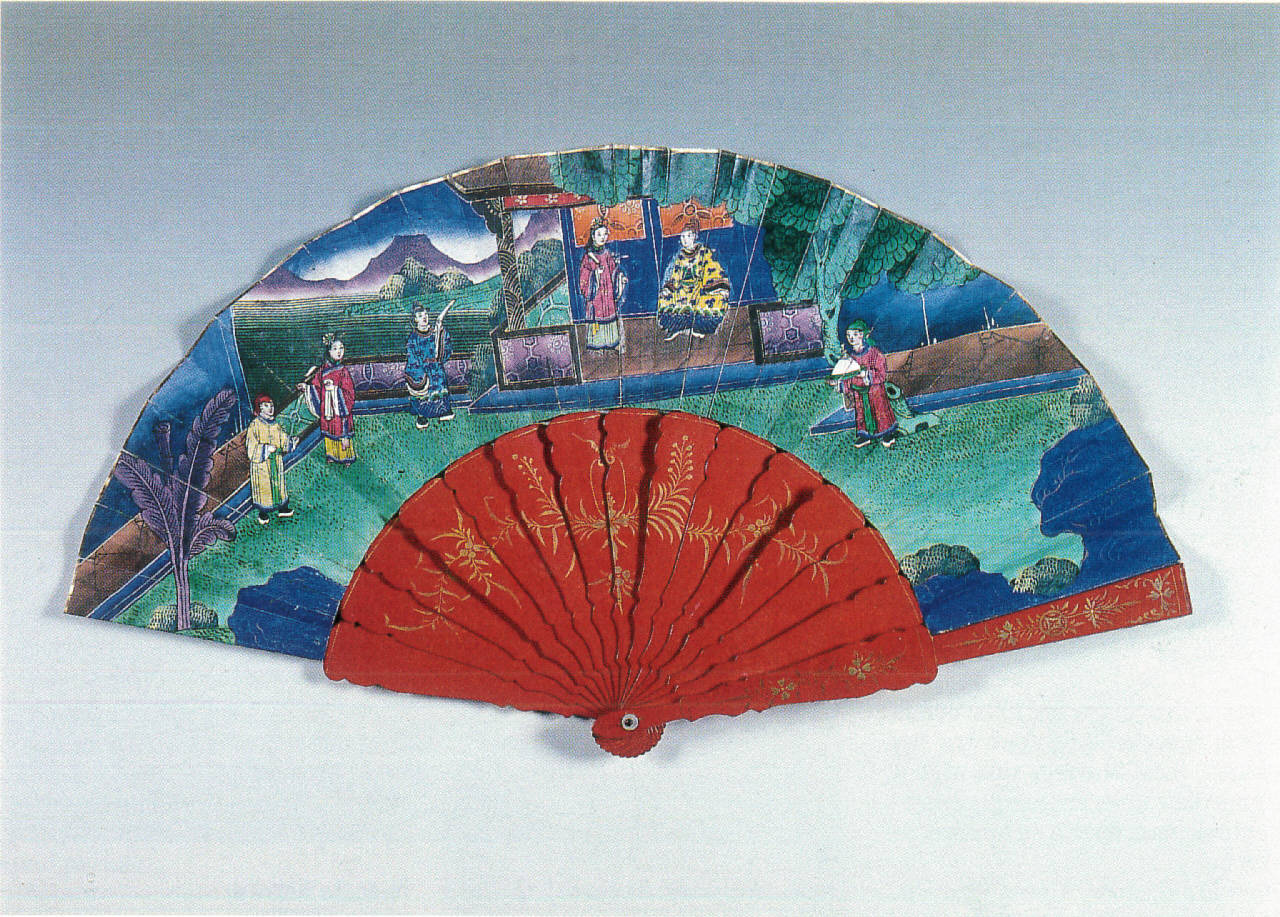Ventaglio pieghevole. Sedici stecche modanate in legno laccato in rosso con fregi dorati; spiegate, sono sttraversate da un tralcio di lunghe e sottilli foglie con fiorellini quadrilobati (stesso decoro al verso). Guardie a spatola tronca decorate da leggeri motivi floreali. Rivetto in madreperla, occhiello in pasta vitrea marrone.\nPagina doppia in carta dipinta a tempera, al recto con elementi in avorio dipinto e in seta operata policroma. Bordino di finizione in carta dorata.\nLa tipica raffigurazione cantonese dei ventagli "Mandarino", a figure e padiglioni, è qui semplificata ad un solo padiglione mentre è dato più spazio al giardino e al paesaggio con personaggi dai volti in avorio e abiti in seta operata, ritratti in una scena di quotidianità. Al verso, su fondo madreperlato, un lungo tralcio di peonie con un fagiano, come è tipico della produzione di Macau.