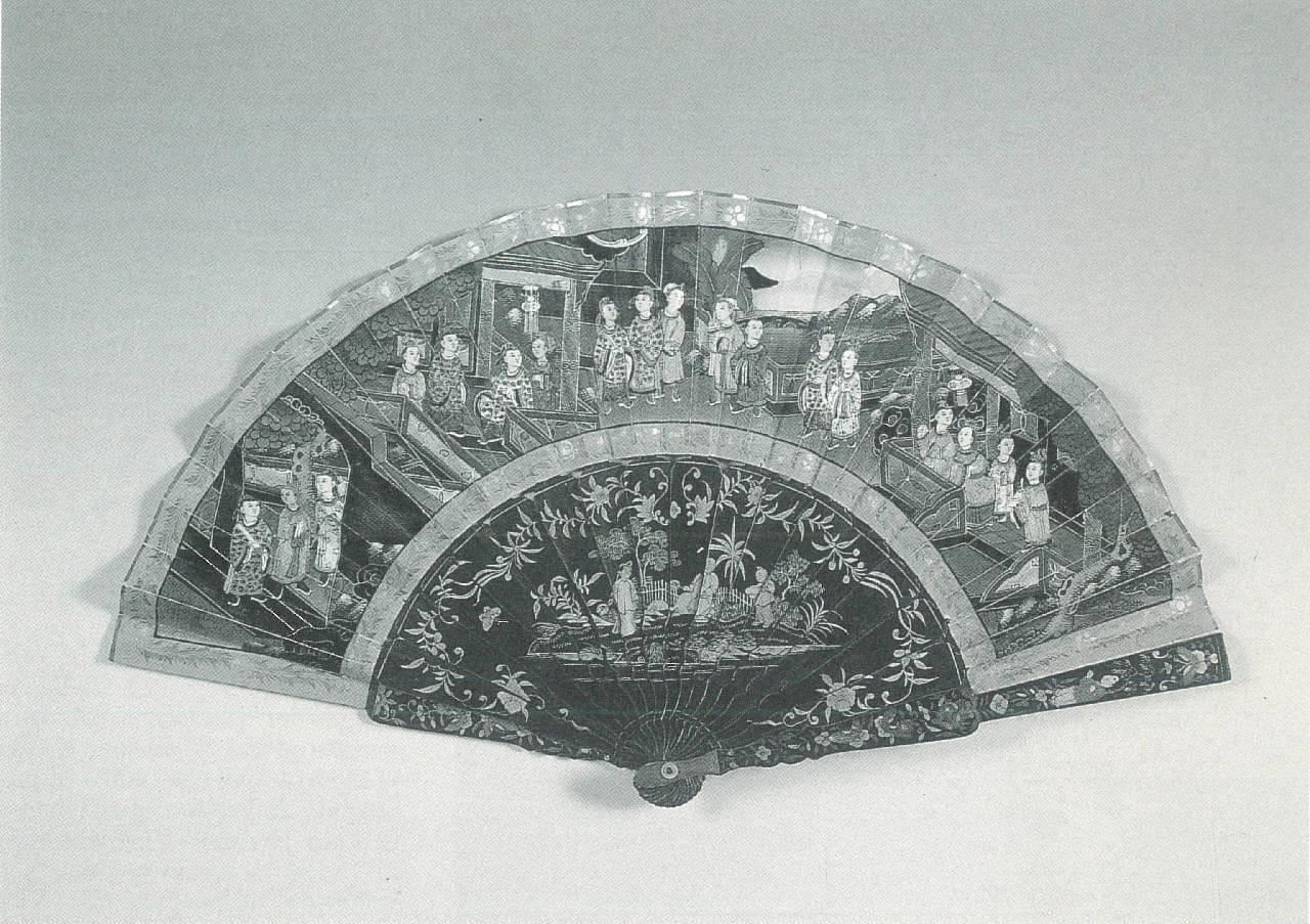 Ventaglio pieghevole. Diciotto stecche in legno laccato nero e oro di due tonalità. Guardie modanate e terminanti a spatola tronca, decorate da fiori sui quali sono posate tre farfalle; in alto, un personaggio maschile in piedi sotto un salice. Le stecche minori, spiegate, mostrano una scena centrale incorniciata da tralci fioriti che raffigura un mandarino seduto con una ventola rivolto verso un inserviente; a sinistra una donna con una ventola in mano. Al verso il decoro delle stecche è il medesimo ma con l'uomo rivolto verso la donna. Rivetto in metallo brunito, occhiello in madreperla incisa.\nPagina doppia in carta dipinta a tempera con elementi in avorio dipinto e seta operata policroma. La scena è divisa in tre padiglioni che si affacciano su un giardino con numerose figure. La pagina è interamente bordata da una fascia dipinta in verde acqua con tralci fioriti color oro. Al verso, su fondo argento, è dipinto un fagiano al centro che si muove tra peonie e altri fiorellini. Il bordo è dipinto color lilla con fiori argentati e tralci fogliati in oro. Bordino di finizione in carta dorata.