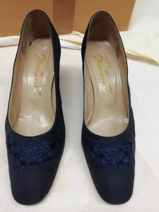 Decolletè in seta blu con motivi floreali ricamati in seta blu in rilievo. Punta e scollo stondati. Tacco largo a stiletto rivestito in seta blu e alto 7 cm; estremità rivestita in gomma. Interno in pelle color avorio; sulla soletta è presente il marchio Calzature Mortarotti Milano. Suola in cuoio nero sulla quale è inciso il numero 9.