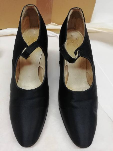 Decolletè modello Mary Jane in raso di seta nero con cinturino all'altezza del collo del piede rivestito in raso di seta nero; chiusura con bottone in metallo e asola singola. Punta leggermente sfilata. Su entrambe le scarpe vi è un segno di punti di colla che formano un fiocco (probabile applicazione precedente in strass). Tacco cubano anch'esso rivestito in raso nero alto 6,5 cm. Interno in pelle color avorio; compare in entrambe le scarpe il numero 4- 461449 7. Suola in cuoio nero dove è inciso 4-4.