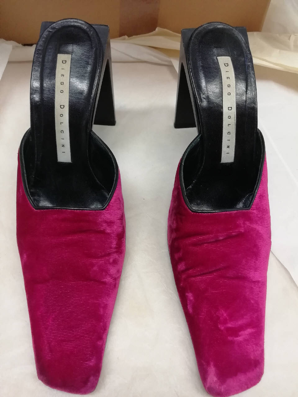Sabot in pelle nera con tomaia in ciniglia fuxia. Bordatura dello scollo in pelle nera. Scollo squadrato nella parte centrale. Punta sfilata, all'estremità squadrata. Interno in pelle nera; etichetta applicata Diego Dolcini. Tacco a stiletto largo e squadrato alto 10 cm. Suola in cuoio nero, dove si possoo leggere il numero 38 1/2 e Made in Italy.