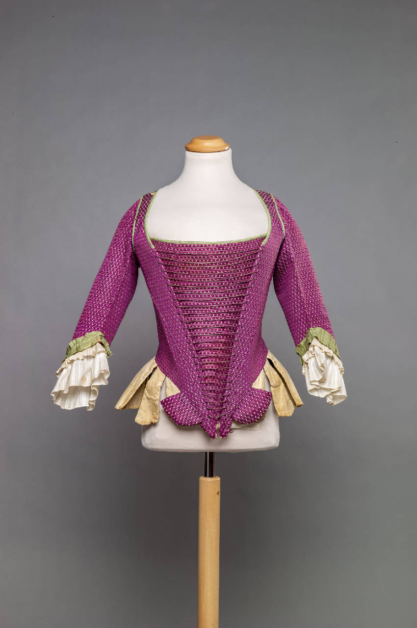 Corpetto composto da busto aperto con maniche a tre quarti e una pettorina ricoperti di seta operata (cannellato di seta a piccoli disegni color rosso-viola, bianco e giallo-verde) e foderati di tela bianca; presenta un'ampia scollatura quadrangolare sul davanti e un piccolo scollo quadrato alla nuca. Le maniche sono guarnite all'orlo con manchettes a due balze di diversa altezza di tela di cotone bianca operata e con un nastro di taffetas verde pieghettato. Le due parti del busto sono unite sul davanti da una legatura fissa con occhielli e cordoncino à la Duchesse, mentre al centro del dorso sono presenti gli occhielli attraverso cui far passare il cordoncino (mancante) della vera allacciatura regolabile.