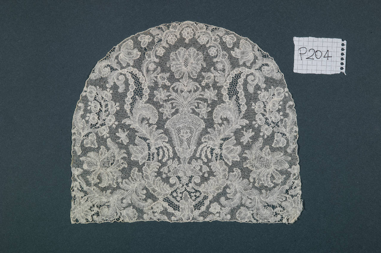 Fondo di cuffia a fuselli tipo Bruxelles, lino sbiancato. Al centro vaso architettonico dal quale escono fiori esalobati, un garofano, volute di foglie palma e grappoli di datteri. Intorno farfalle, frutti, foglie a piuma e grappoli di melograni.