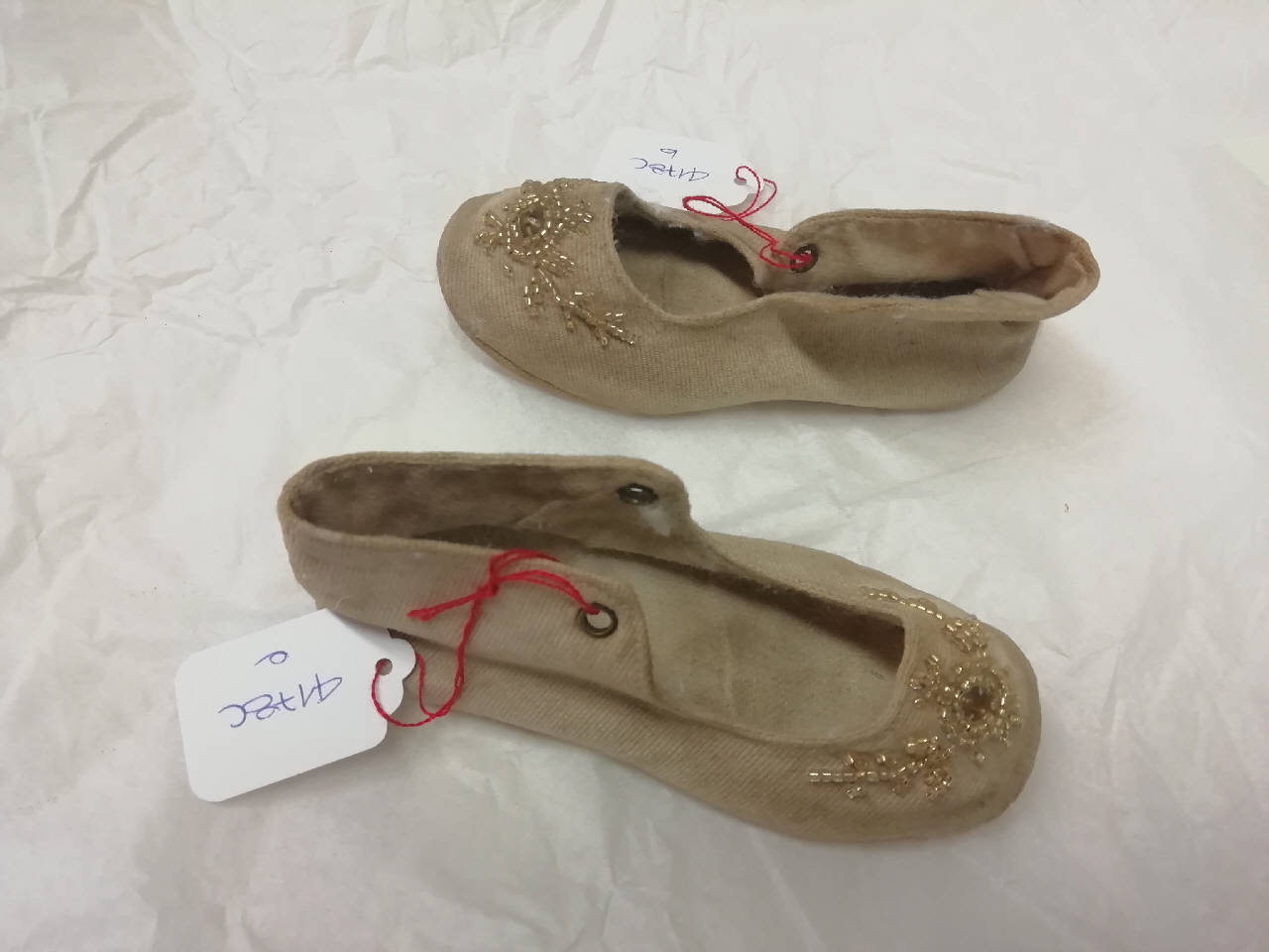 Scarpe da bambina interamente in cotone cannellato beige con scollo e punta tondi. Sulla punta sono presenti ricami realizzati con piccoli cilindri dorati che creano un motivo a tralcio e che si espande su tutta la larghezza della punta. All'altezza delle caviglia, alle estremità della stoffa, vi sono due piccoli fori rivestiti in metallo in cui far passare un cordino (mancante) per la chiusura.