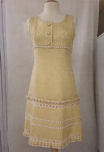 Abito estivo da giorno linea a trapezio in lino giallo con passamaneria a fiori bianchi sui bordi e allo scollo. \nregolazione anteriore con tre bottoni che riprendono il motivo della passamaneria. \ndoppia fodera, una in taffetas in colore, la seconda in cotone bianco.