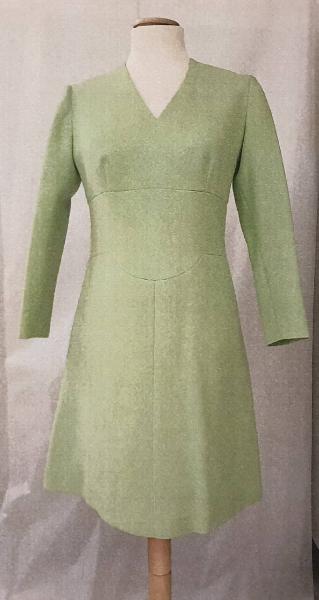 Abito da giorno linea a trapezio in lana verde chiaro, manica lunga. \nfodera in taffetas di seta in colore.\nnastrini all'interno delle spalline chiusi con automatici trattengono le spalline del reggiseno.