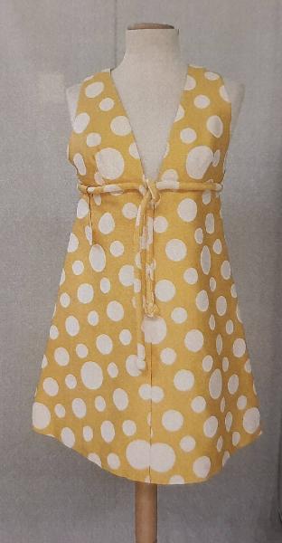 Abito estivo linea a trapezio in cotone giallo a pois bianchi chiuso nella parte posteriore con una cerniera nascosta; cintura realizzata nello stesso tessuto a forma di cordone imbottito e concluso da nodi.\nfodera in taffetas bianca.
