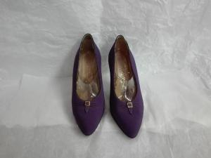Decolletè in tessuto viola tacco a spillo e plateau; arricciatura nella parte anteriore della tomaia chiusa da una piccola fibbia metallica; fodera in pelle di capretto; \nsul sottopiede marchio "Ronchi / MILANO/ Corso Matteotti, 9 / T.702.061"