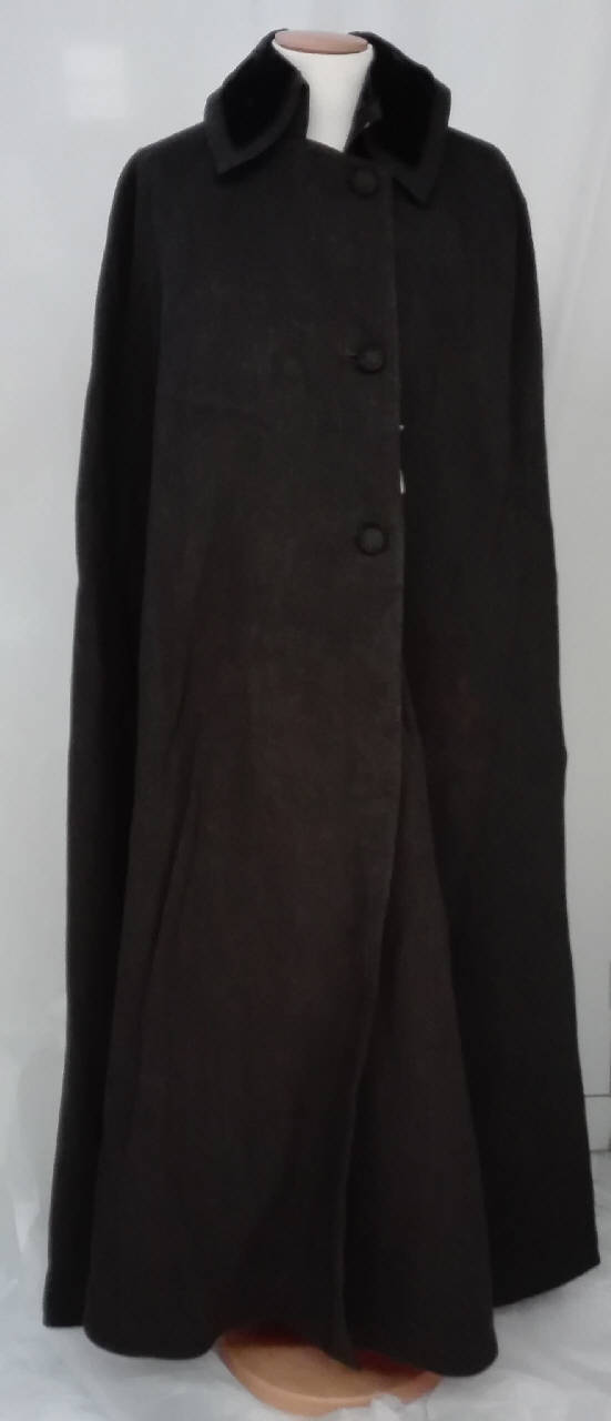 Cappa in lana grigia scura, colletto con applicazioni in velluto nero rifinito con un cordoncino; chiusura con tre bottoni rivestiti in tessuto e ganci metallici.