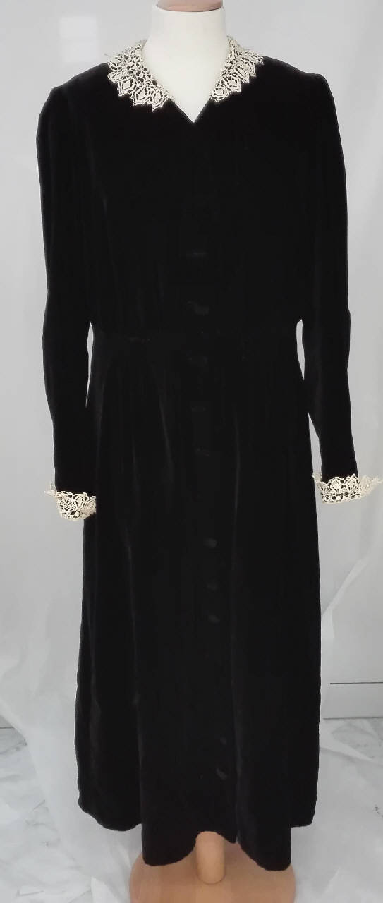 Abito lungo in velluto tagliato di colore nero, chiusura frontale a quindici bottoni ricoperti in velluto; gonna leggermente arricciata in vita; \ncolletto e polsini decorati con merletto ad ago color ecrù; sui polsini quattro bottoni rivestiti in velluto di chiusura.