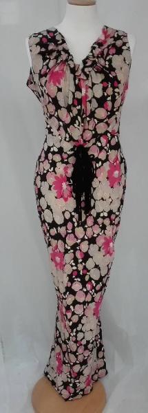 Abito da sera linea sirena in seta con stampa floreale, senza maniche.\nSul retro ampia scollatura a V e otto bottoni di chiusura.\ndue spacchi laterali; in vita decorazione in cordoncino di velluto nero