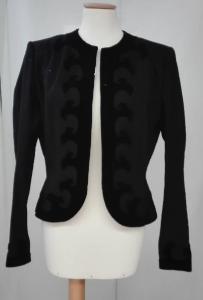 Bolerino nero monopetto a maniche lunghe con applicazioni in velluto lungo gli orli con motivo di volute stilizzate; \nchiusura frontale a quattordici ganci metallici.