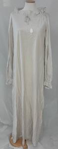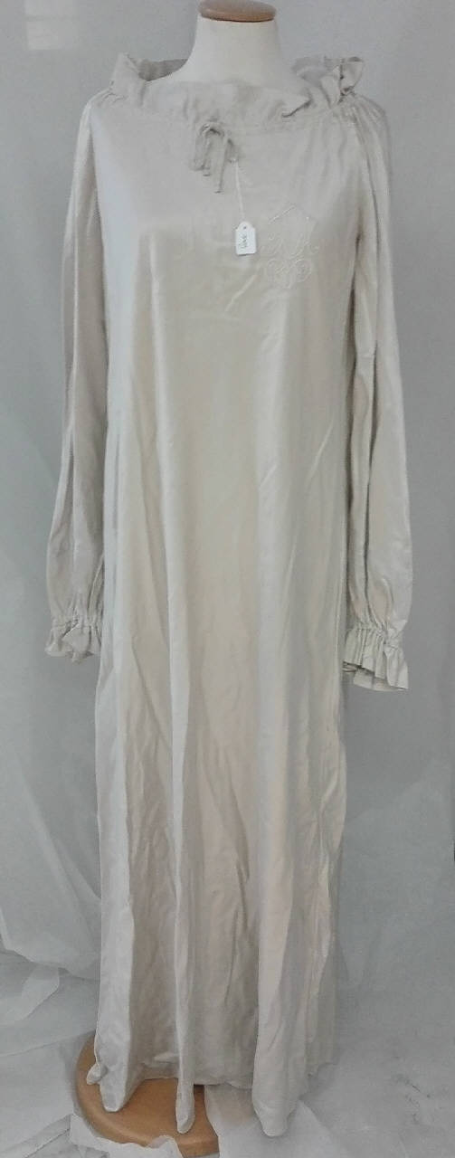 Camicia da notte lunga in raso di seta color tortora chiaro con maniche lunghe arricciate ai polsi; scollo tondo arricciato tramite nastro passante in coulisse; \nricamo a punto pieno con iniziali sul lato sinistro