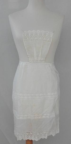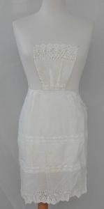 Grembiule da servizio in tela di cotone bianco con decorazioni filet e a ricamo ad intaglio, orlo inferiore smerlato.
