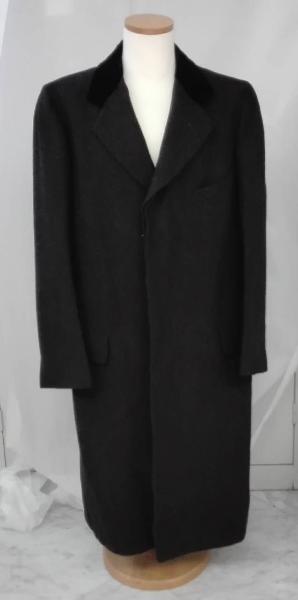 Cappotto maschile da sera color grigio fumo di Londra, con colletto in velluto nero, monopetto con chiusura a tre bottoni in pasta, due tasche frontali e un taschino.\nnell'interno, fodera parziale e taschino con etichetta della sartoria "John Wanamaker New York / Dec 28 1927"