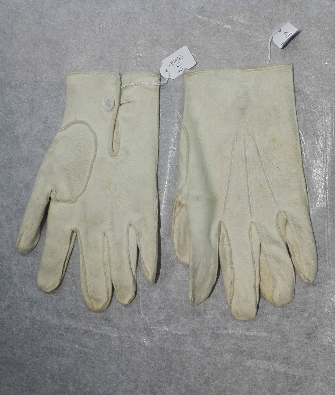 Paio di guanti maschili in pelle scamosciata bianca; chiusura al polso con bottone in madreperla
