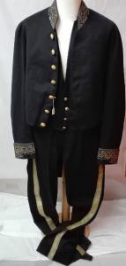 Divisa civile console sabaudo in panno di lana composta da: \nMarsina (C_3248a) in panno di lana blu scuro con decorazioni in canutiglia, paillettes e filo metallico dorato lungo il colletto, i polsini e sul retro; chiusura frontale a sette bottoni con aquila sabauda; sul retro, otto bottoni dorati con aquila sabauda.\nGilet (C_3248c) in panno di lana blu, retro in taffetas scuro (nero/marrone) con chiusura frontale a quattro piccoli bottoni con stemma sabaudo; sul retro chiusura regolabile con cinturino e fibbia metallica.\nPantaloni (C_3248b) in panno di lana blu con decorazione in passamaneria dorata laterale; patta chiusa da sette bottoni, due tasche; sul retro cinturino con fibbia metallica "1871", fodera interna in lino.\nMarsina (C_3248d) in panno di lana nera con decorazioni in filato metallico dorato, paillettes, canutiglia lungo i profili, sui polsini ricamo con nodo savoia e motto "F E R T"; colletto, polsini e patte delle tasche posteriori in velluto rosso.\nChiusura frontale a nove bottoni, due sui polsini e due sulle code: tutti decorati con corona.\nall'interno etichetta scritta a mano "Conte L(...) Corti"