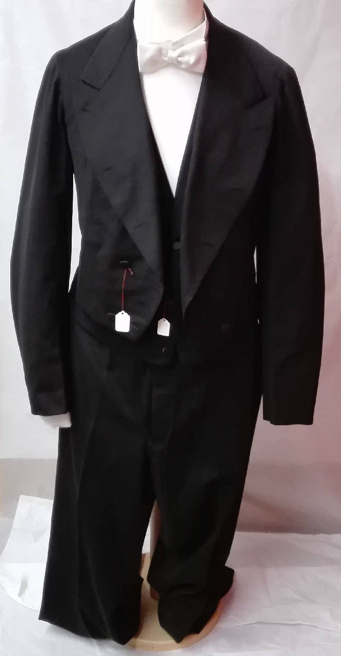 Completo maschile composto da:\nFrac (C_3249a) in lana nero chiusura doppiopetto a quattro bottoni, fodera in colore.\nGilet (C_3249b) sciallato in panno di lana nero con chiusura a tre bottoni rivestiti in raso in colore, due tasche; cinturino con fibbia metallica sul retro;\nGilet (C_3249c) sciallato in panno di lana nero con chiusura a cinque bottoni rivestiti in raso in colore, tre tasche; cinturino con fibbia metallica sul retro; \nPantaloni (C_3249d) in panno di lana nero, chiusura a patta a sette bottoni e gancio meccanico, in vita sei bottoni con stemma (?), due tasche laterali; sul retro cinturino con fibbia metallica.\nPapillon bianco con velcro probabilmente non coevo.