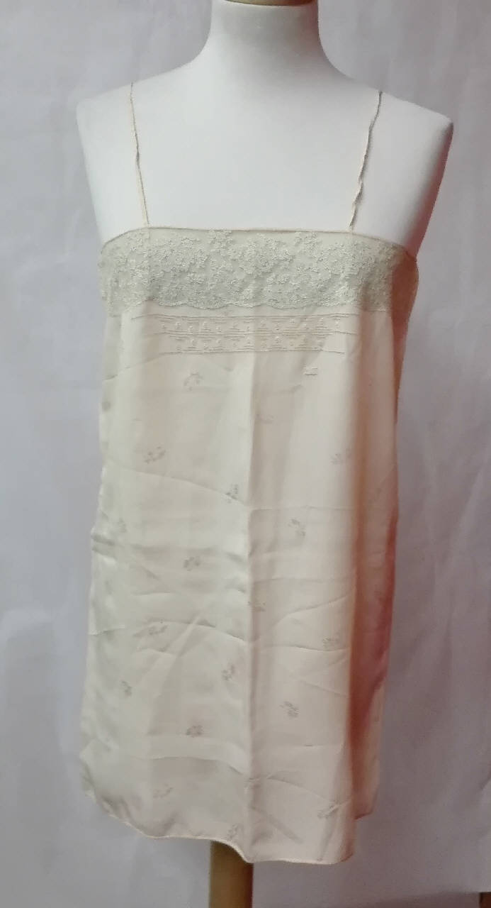 Sottoveste corta di seta operata color pesca, decorazioni floreali, inserto anteriore di pizzo meccanico color avorio, cifre ricamate sul fronte "MT"; spalline in seta.