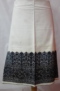Telo in cotone bianco con bordo inferiore (25cm circa) ricamato a decoro geometrico in due tonalità di blu.\ncomposto da due pezze unite.