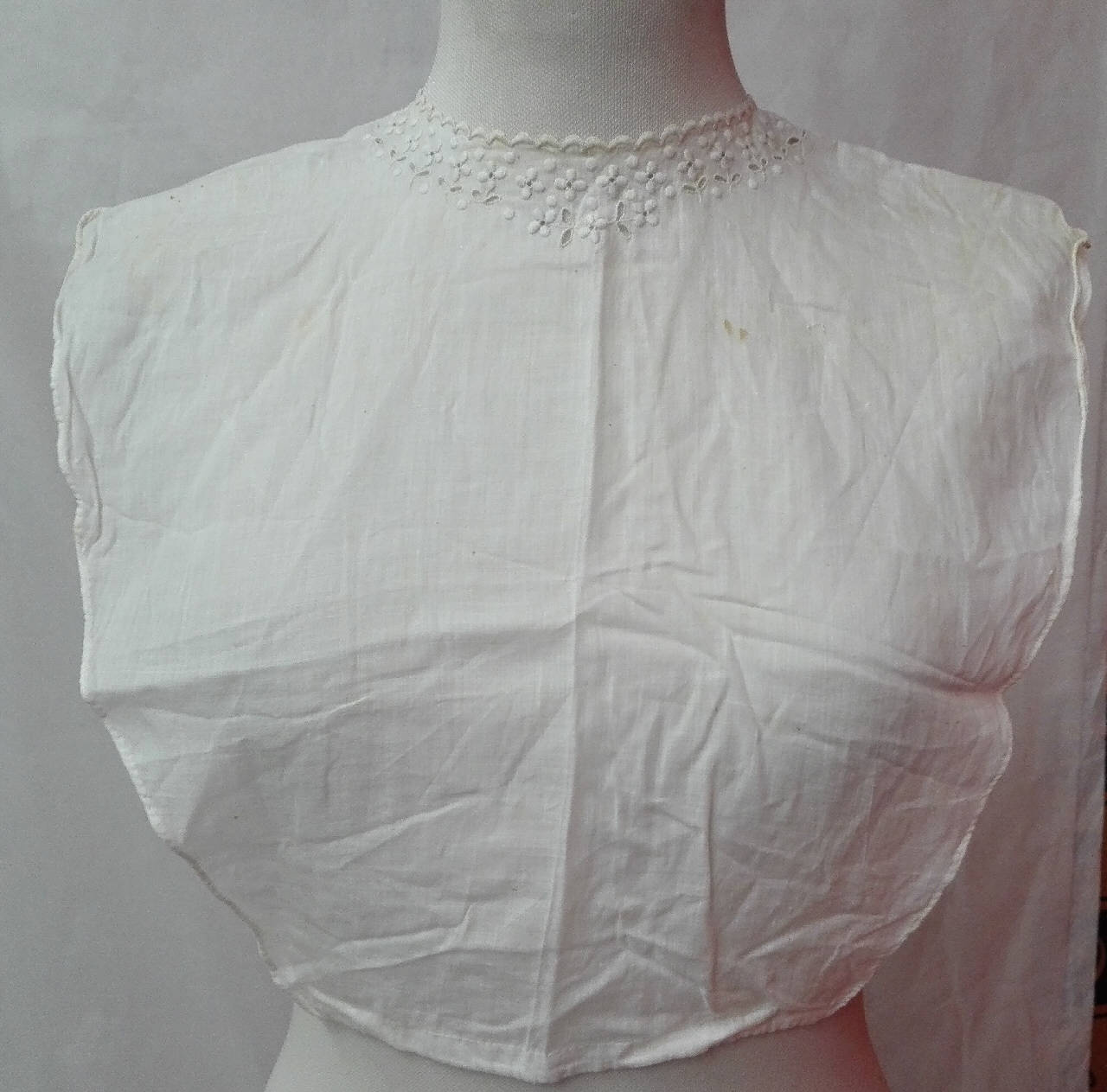 Pettorina in batista di cotone bianco con scollo ricamato a punto pieno e traforo a motivo floreale.\nchiusura posteriore a due bottoni e nastrino.