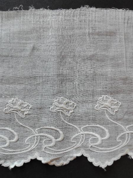 Bordo centinato di cotone con ricami a motivo floreale in stile liberty in punto pieno e piccoli trafori.