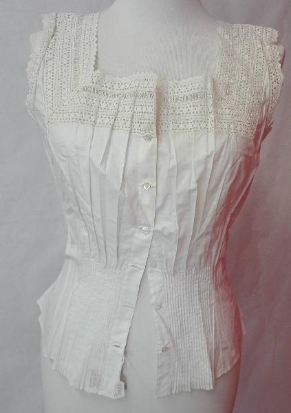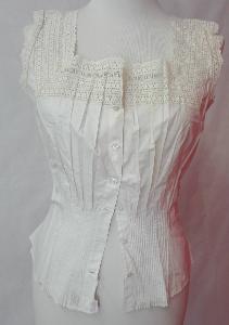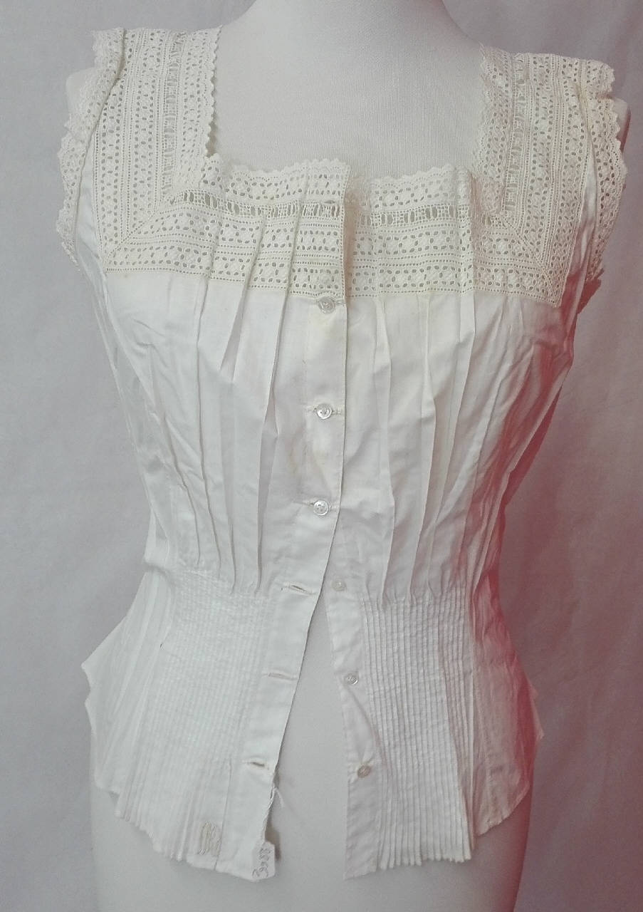 Copribusto in tela di cotone bianco con scollo carrè e passanastro in Sangallo. Cifra ricamata in basso a destra "MR"