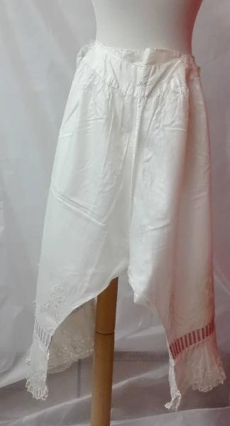 C_2760a: Mutande di tela di cotone bianca lunghe al ginocchio allacciate in vita con nastri di cotone; iniziali ricamate "RC"; al fondo passanastro e nastro di seta lilla, volant smerlato con entre-deux di pizzo a fuselli meccanico tipo Valenciennes.\nC_2760b: Mutande di tela di cotone bianca lunghe al ginocchio allacciate in vita con nastri di cotone; iniziali ricamate "RMC"; al fondo passanastro e nastro di seta rosa, volant in pizzo a fuselli meccanico tipo Valenciennes.\nC_2760c: Mutande di tela di cotone bianca lunghe al ginocchio allacciate in vita con nastri di cotone; iniziali ricamate "RC"; al fondo passanastro e nastro di seta lilla, volant in broderie anglaise.