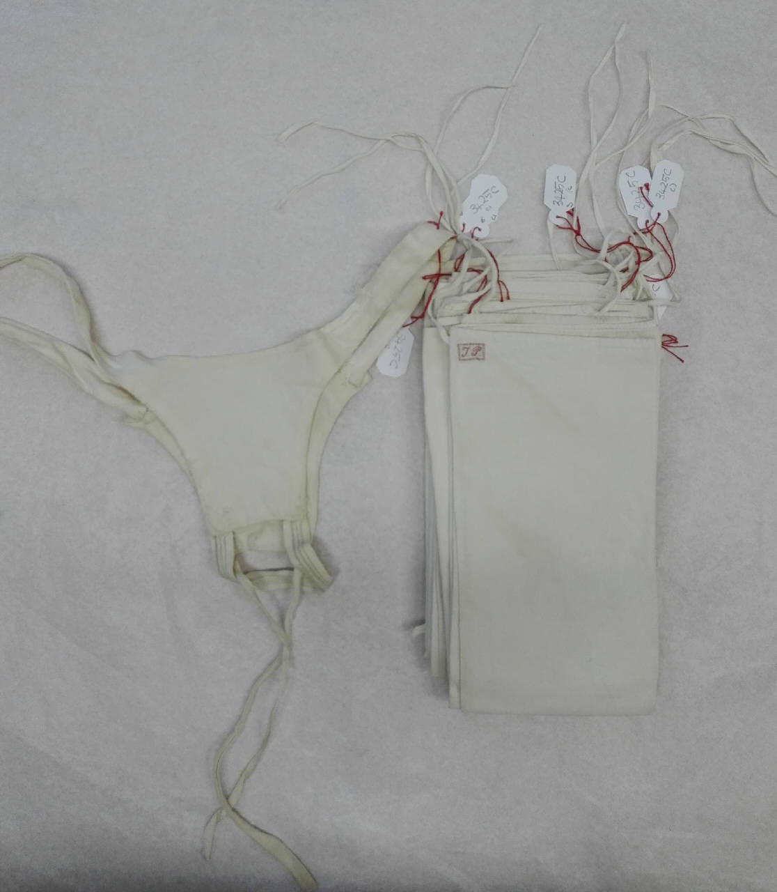 Sei pannolini in tela di cotone bianca con piccolo monogramma applicato ad etichetta "IP" e relativa cintura di supporto.