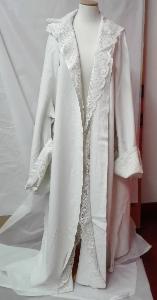 Accappatoio femminile con maniche lunghe ed ampie realizzato in tela di lino bianca con applicazioni allo scollo, ai polsi e lungo l'apertura anteriore di merletto a fuselli.