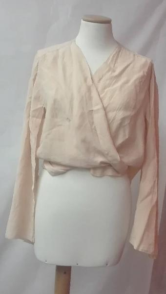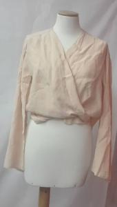 Pegnoir di taffetas di seta color pesca, maniche lunghe aperte, lunghi lembi che si annodano nella parte posteriore.\nparte delle cuciture eseguite a mano.