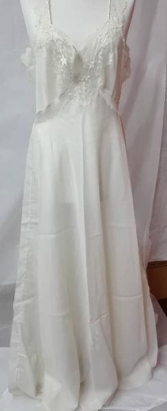 Camicia da notte lunga ai piedi in crespo di seta rosa chiarissimo con intarsi in vita in raso rosa; spalline e scollo profilate da un merletto meccanico color avorio con applicazioni a motivo floreale in raso rosa.