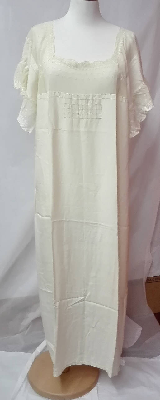 Camicia da notte in seta color avorio con carrè e maniche ad aletta di tulle ricamato; sul petto motivo decorativo quadrangolare a giorno.