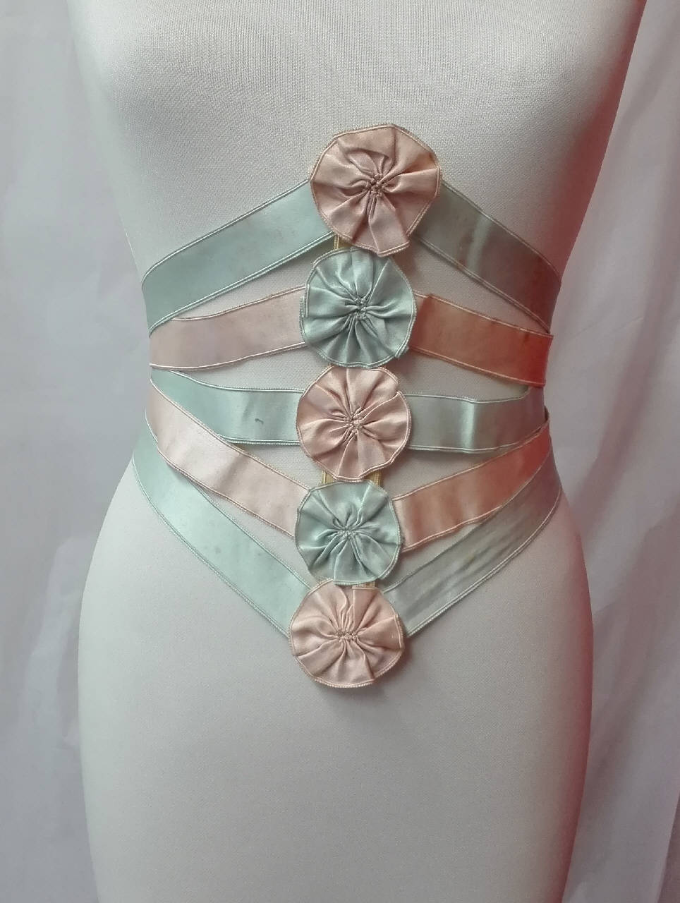 Stringivita composto da nastri di raso di seta color acquamarina e rosa; stecca centrale e decorazione a rosette di nastro, sia sulla stecca che sulla chiusura a gancetti.