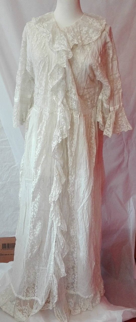 Vestaglia di mussola di cotone bianco con manica a tre quarti e apertura anteriore con diciotto automatici; ampi intarsi e balze di pizzo valenciennes.