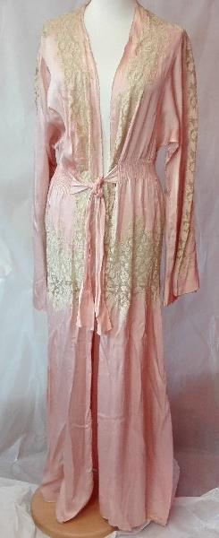 Vestaglia da camera di raso di seta rosa con intarsi di pizzo valenciennes color avorio su scollo, maniche e sotto il punto vita. \nallacciatura centrale con nastro di seta rosa e motivo plissettato in vita.\nlungo gli orli piccolo motivo smerlato a punto festone.