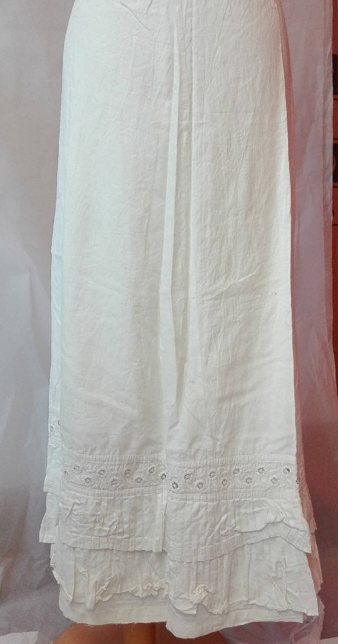C_2321a: sottogonna in tela di cotone bianco, chiusura in vita con lacci; decorazione a doppio livello di balze plissettate e ricamo a broderie anglaise\nC_2321b: sottogonna in tela di cotone bianco, chiusura in vita con lacci; balza finale in broderie anglaise con orlo smerlato.