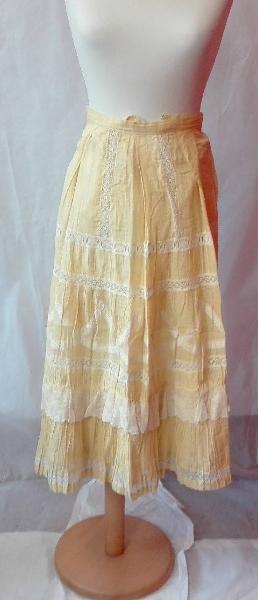 Sottogonna in mussola di cotone gialla, chiusa in vita con un lacci (uno mancante); \nfalsature e passanastro in merletto a fuselli meccanico; balze inferiori in merletto e con motivo a pieghine.