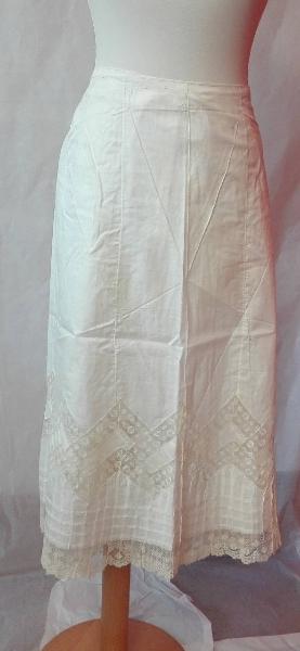 Sottogonna in mussola di cotone bianca chiusa in vita da laccetti; \ndecorazione con entredeux in merletto meccanico a motivi circolari; balza inferiore decorata da minute pieghe cucite disposte in orizzontale a gruppi di tre e bordata da pizzo a fuselli meccanico.\nin vita sul fronte ricamo a punto pieno "Mimy"