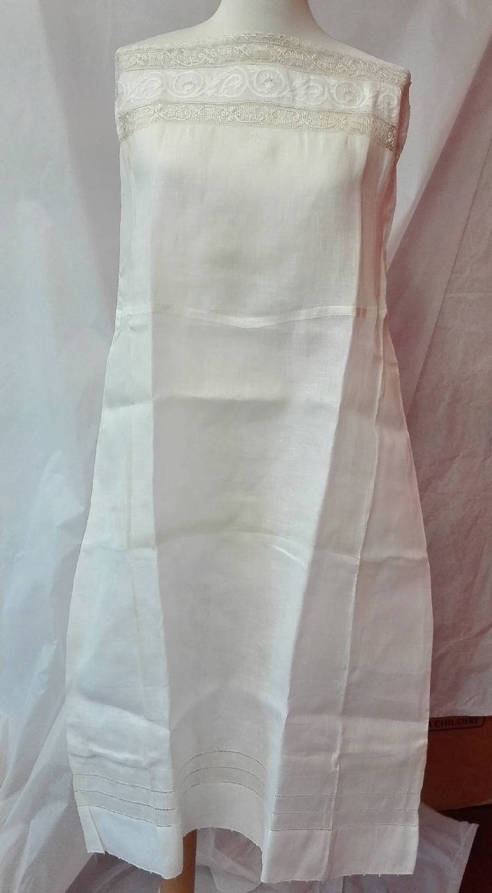 Sottoveste senza spalline in tela di lino bianco con bordura e intarsio a filet con motivi floreali stilizzati, fascia ricamata a punto ombra con girali vegetali; elastico in vita e ricamo a jour sul fondo.\nMonogramma ricamato al centro sotto lo scollo "PR" racchiuso da un ovale con nodo d'amore in cima.